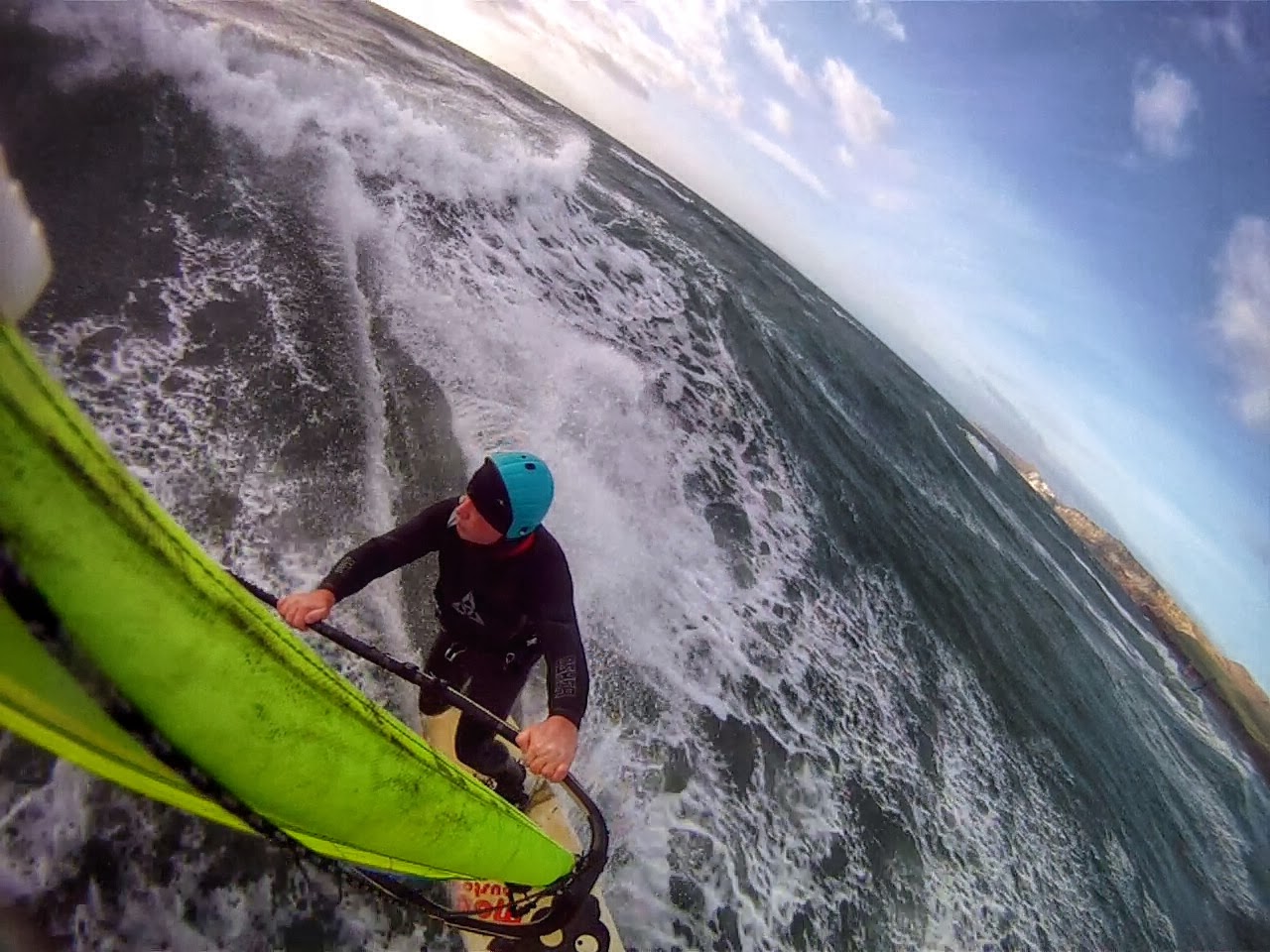 Generally I mount the camera on the second batten above the boom, so roughly about 1m above the boom cut out. That slighter lower position still captures a full frame of rider and board (usually) but without the rider looking too distant and any waves too small.
