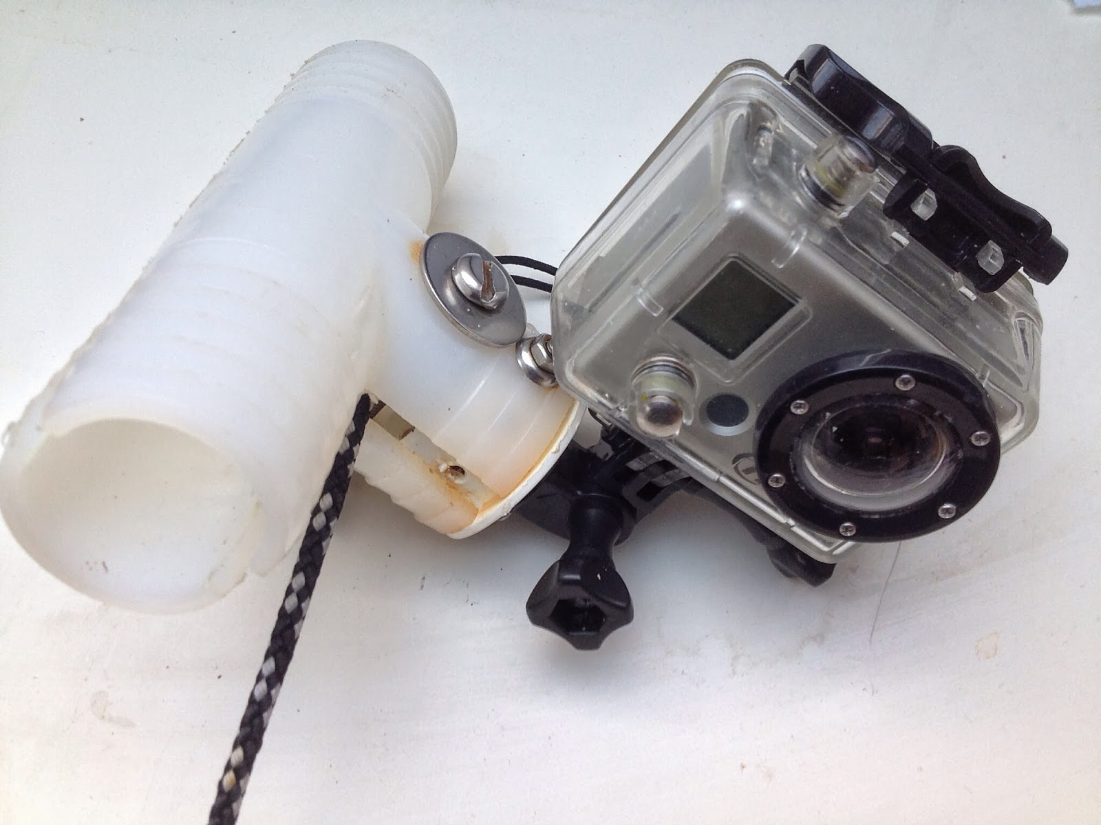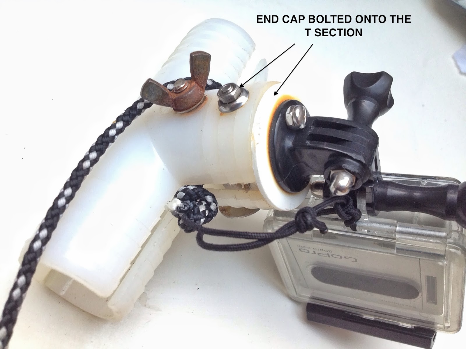 The T section clips onto the mast and the (slightly rusty) bolt and wingnut can be tightened for a better grip.The other components are GoPro angles and mounts that are widely available.